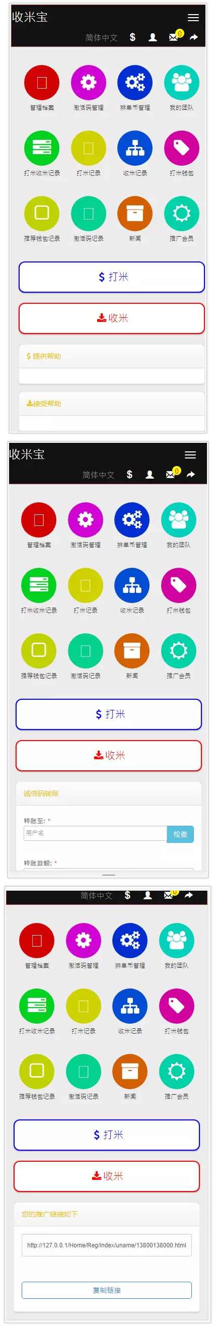 最新最火收米宝互助系统源码:全新界面+抢单+短息+排单+激活+援助+拆分全新修复优化!该版本是带有抢单功能的,也隶属于收米宝的一系,全网最新版本!