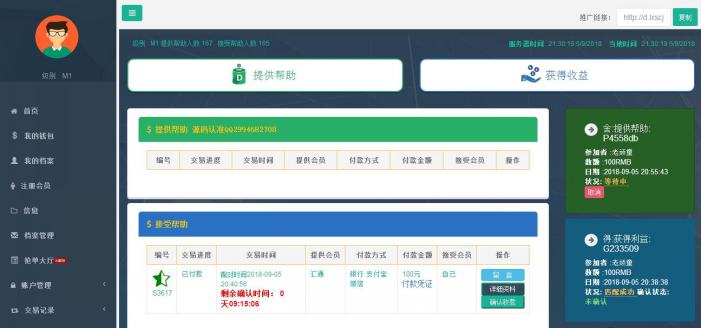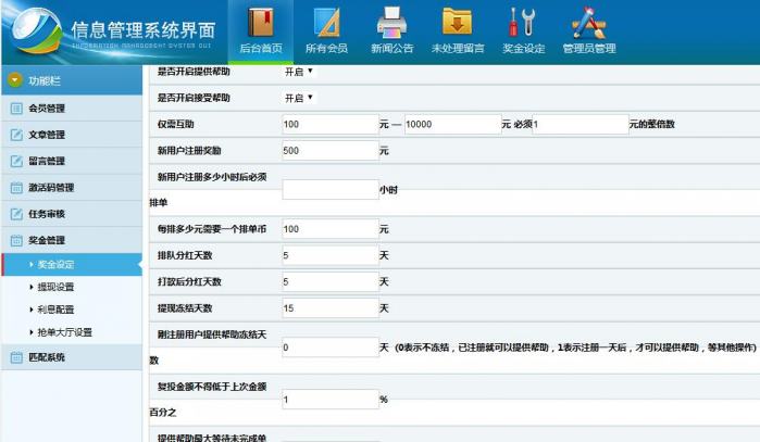 最近更新功能如下: 1、 完美修复 。利息 分红 超时封号,重新匹配,经理代数奖 会员级别奖,推荐奖 都一一测试ok 2、 支持短信验证 提醒。电子门票。在线购买激活码 3、 增加排单码功能,排单需要购买排单码才可以排单 4、 完善静态奖、动态奖、团队奖参数新增加按时打款奖励打款额百分比 5、 完善排单未取消可以继续排单 6、 增加会员网络图等功能