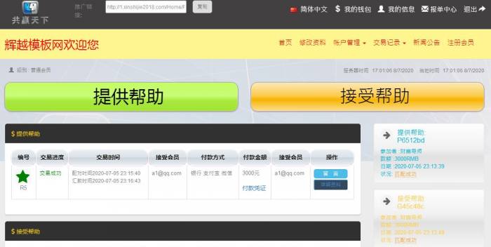 新版 thinkphp 内核开发的互助平台源码,共赢天下互助平台理财源码辉越模板网独家修复版, thinkphp 内核开发,自适应 PC+WAP+激活码团队功能,每排一遍单都需要一个排单币, 功能非常的完善,界面也不错,拿来即可搭建运营,带用户中心,内置激活码功能,经理模式等等。