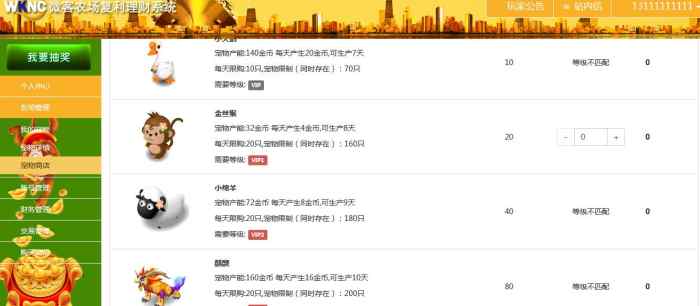 金丝猴VIP1会员(直推10人)可购买,20币一只,周期8天,每天产4币,每天限购20只,最多只能养160只哦!当你的农场有160只金丝猴的时候,你每天就有640币的收入啦!