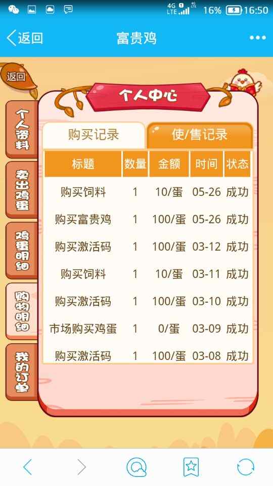 1.购买1只富贵鸡100个富贵蛋,每天花10个富贵蛋购买饲料喂养富贵鸡,富贵鸡开始生产富贵蛋(倒计时24小时)【不喂养富贵鸡不会生产富贵蛋也就没有收益】每天产富贵蛋13个,相当于每天收益3%。