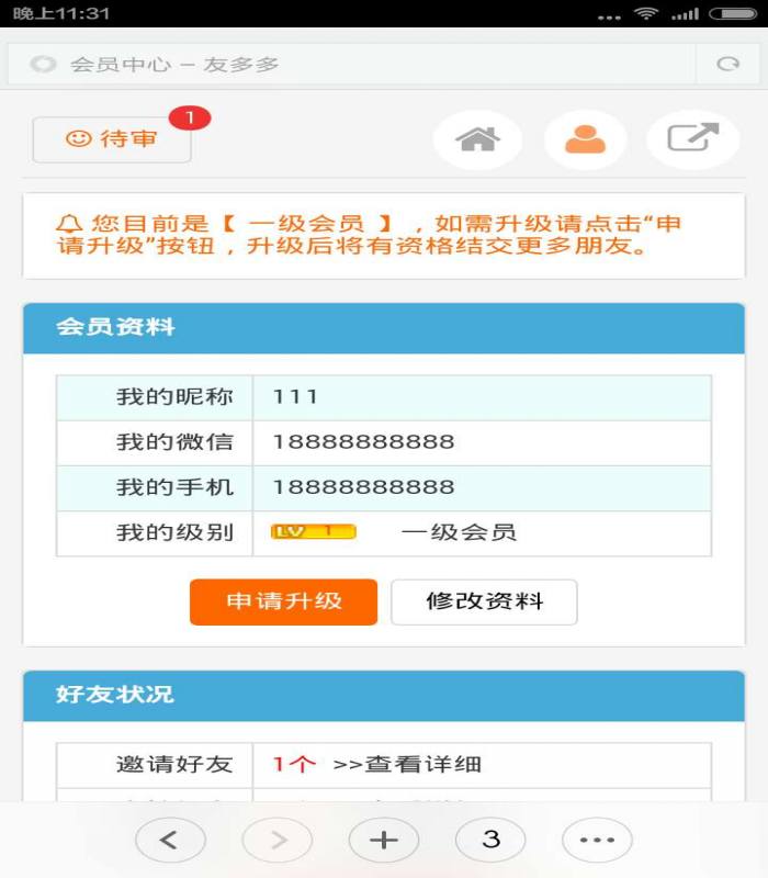 当V友升到6级会员后,将有权利成为v友群主资格,你群里的新v友注册激活时,每人都会向你赠送10元红包,此时您的一个微信号应该满了,然后登陆您的后台修改资料可以修改新的微信号继续体验被动加友。