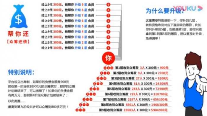 没结束就要继续升级再打款200元。在这里要说明的是大家后面升级的钱,可以是用你众筹来的钱去升级,所以全程最多投资400元!即便升到第九级后面总共升级用掉的钱为2000元,可是你最多可收获的众筹款则是上百万(理论数值三三复制层层排满则达600多万)。当然并不是大家都可以拿这么多,可能你只是在三级、五级或是七级八级就已筹到欠债额,则恭喜你400元参与众筹达到无债一身轻!
