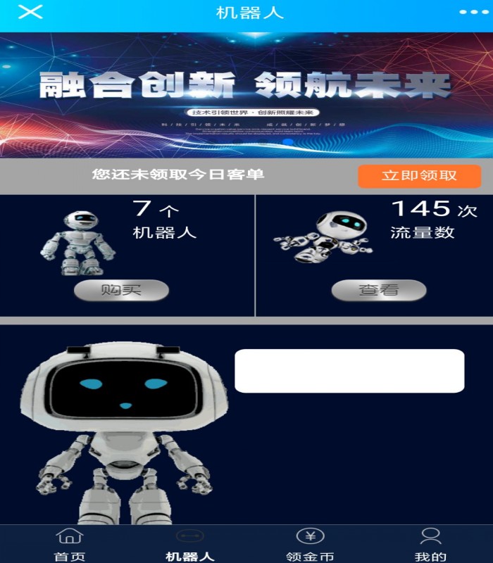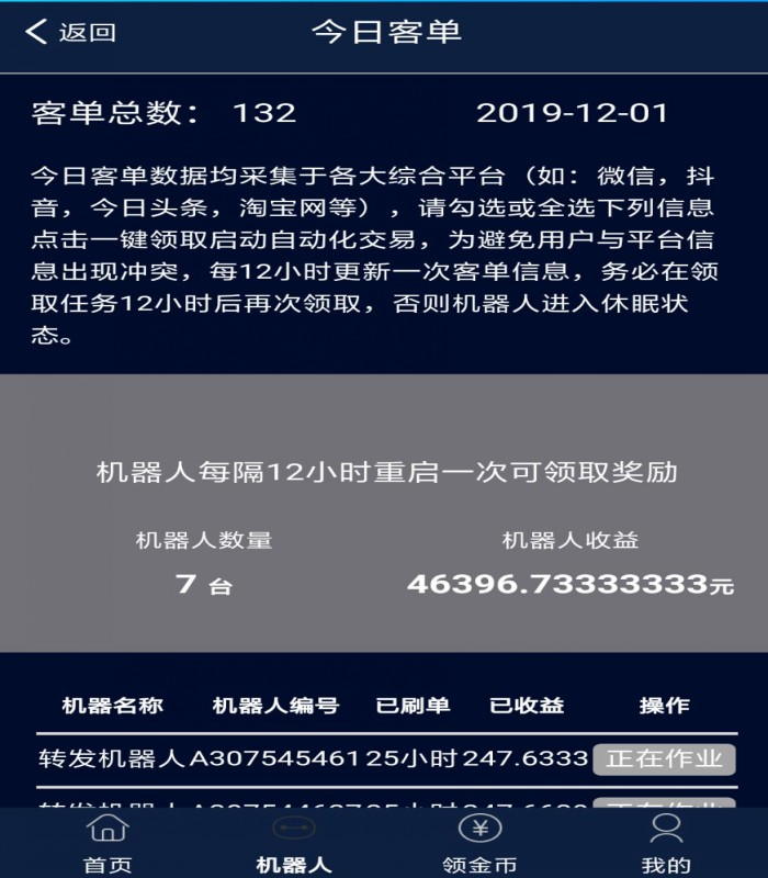 智能Al机器人年末巨献,智能Al机器人平台由深圳创客云端科技有限公司创立,其平台所创造价值在于通过桥接的方式给市面上运营平台进行流量筛选引入从而获取流量粉进行变现,根据实时流量大小进行转換为现金,市场用户可进行投资形式进入平台,购买流量机器人来进行流量的自动捕获,每日可获取不定值的流量变现,目前市场机器人单价在100元RMB,随着机器人不断的捕获能量可使机器人能够更加敏捷的获取高流量也就是高回报。