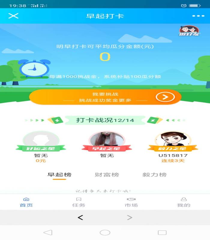 1、用户需用活力值挑战卷轴任务,即可获得次日早起打卡机会。 所有用户缴纳挑战卡总值进入次日早起打卡奖金池中;