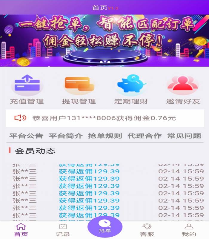 建议您点击自动抢单了不要离开抢单界面。 或者有事离开的时候点击停止抢单,系统才能知道您已经取消了抢单操作。 代理制度 可享往下三级代理佣金,一级16%、二级8%、三级4。 提现规则 佣金满100元就可以提现,提现T+1到账,15点前。