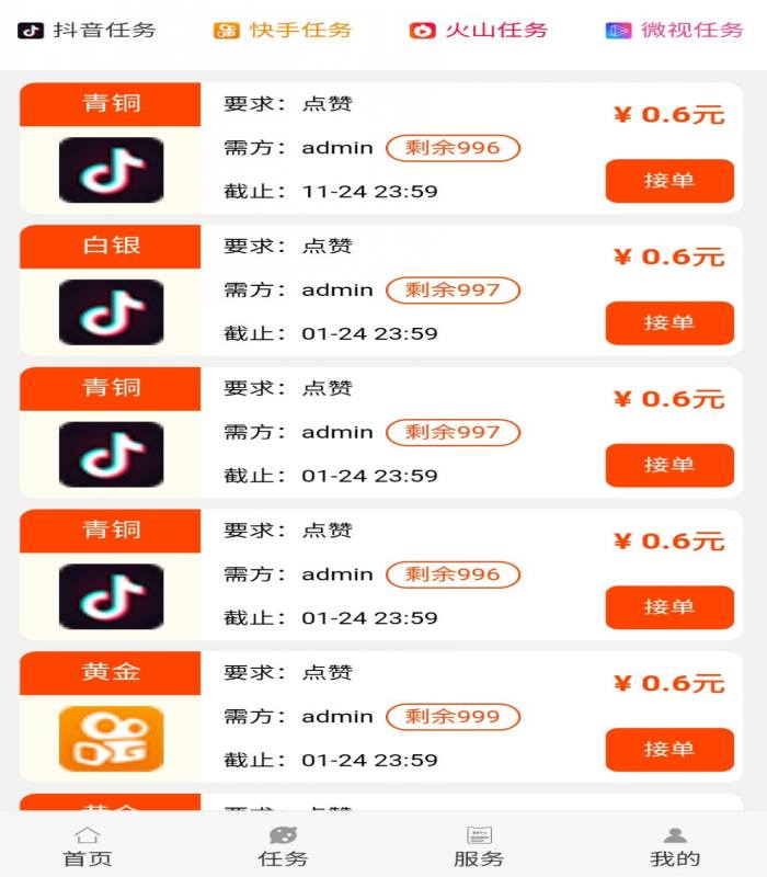 1、全新ui清新主页可接取抖音快手火山微视任务点赞关注 2、任务界面可自动执行任务 ,任务完成之后资源部源码后台审核,即可领取佣金 3、完整的会员制度。(璀璨钻石、钻石、黄金、白银、青铜、)以此类推(后台都可设置任务数量,会员费) 4、个人中心可提取佣金、推广分销、 等等。 5、修复众多BUG 6、无需短信验证即可注册,更方便跨界 7、可封装APP