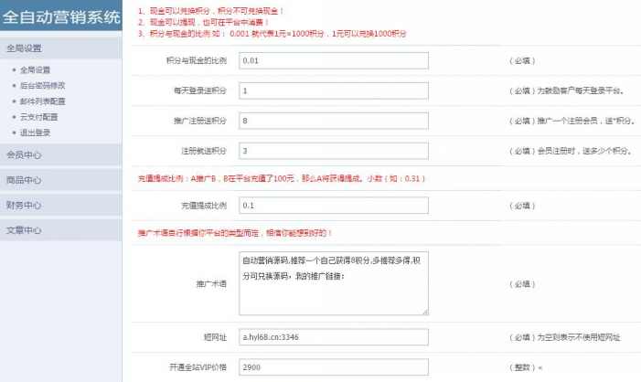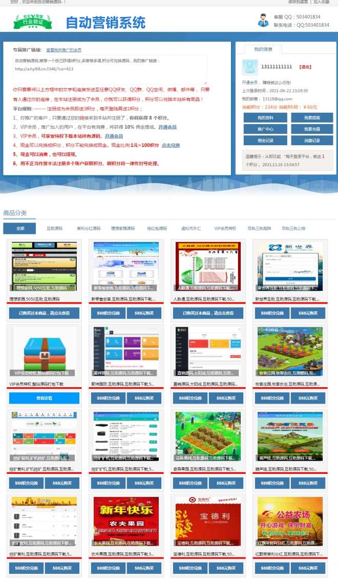 平台规则: ------ 注册成为会员即送3积分,每天登陆再送1积分; 1、你推广的客户,只要通过您的链接来到本站并注册了,你将获得 8 个积分。 2、VIP会员,推广加入的用户,在平台有消费,将获得 10% 佣金提成。开通会员 3、VIP会员,可享受特权下载本站所有源码。开通会员 4、现金可以兑换成积分,积分不能兑换成现金。现金比例:1元=100积分 点击兑换 5、现金可以消费,也可以提现。 6、用不正当作弊手法注册多个账户获取积分、刷积分将一律作封号处理。