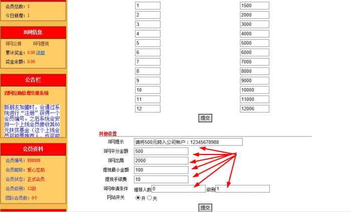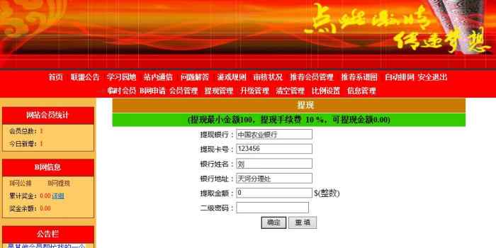 6.系统采用梯形付款、梯形收款的方式倍增会员的收入。会员每上升一个级别,其收入会呈2的几何倍数倍增。从第 二层起,会员拟成为某一层的合格会员时,系统会提示其向上线会员付款。只有按系统的提示完成了付款并得到收款会员的确认,才是该层(即该级别)的合格会员。反之,则为不合格会员。不合格会员没有权利接收该层会员的付款。此时,系统会绕过他另指定他人为收款人。只有当他按系统的要求完成了该层的付款,才有权利接收该层每个会员的付款。(自己开通成为正式会员后,自己第一层的2个会员的钱都是给自己,然后自己从赚的180元去继续升级给自己上面的第二层会员(系统会显示给哪一个会员)升级二级会员,成为二级会员后自己才可以拿自己下面的第二层的4人的升级见点180元,共收获720元,然后自己给上面的第三层的会员300元升级三级会员后,自己就可以拿下面第三层的8人升级见点300元,共收获2400元、、、、以此类推到第10层。)