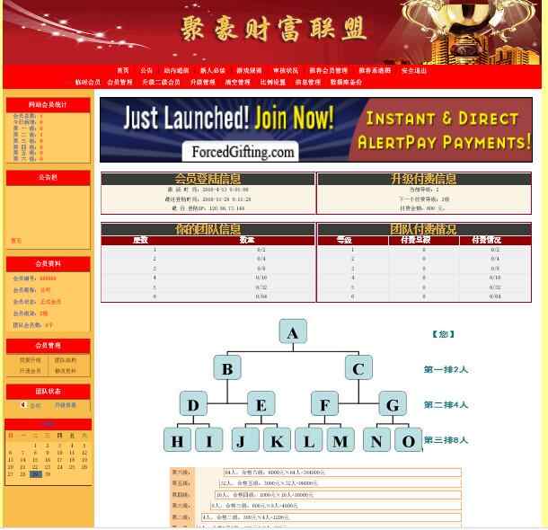 5.系统采用梯形付款、梯形收款的方式倍增会员的收入。会员每上升一个级别,其收入会呈2的几何倍数倍增。从第二层起,会员拟成为某一层的合格会员时,系统会提示其向上线会员付款。只有按系统的提示完成了付款并得到收款会员的确认,才是该层(即该级别)的合格会员。反之,则为不合格会员。不合格会员没有权利接收该层会员的付款。此时,系统会绕过他另指定他人为收款人。只有当他按系统的要求完成了该层的付款,才有权利接收该层每个会员的付款. 6.会员付款后,要保管好汇款凭证,并用电话及时通知收款会员。没有及时通知收款会员进行确认,其损失自负。