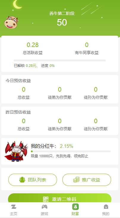活跃收益:邀请好友得两级活跃收益提成,徒弟B100.,徒孙50,徒弟每天活跃,活跃收益天天得