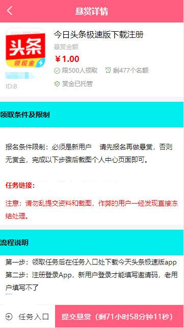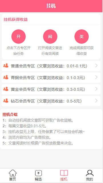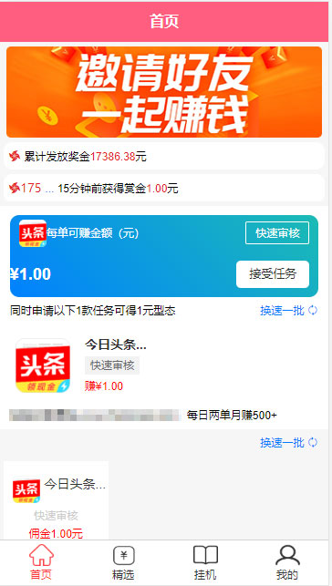 挂机阅读文章赚钱,首页还有悬赏任务,悬赏任务对接了任务联盟,并且也支持后台单独上传任务。