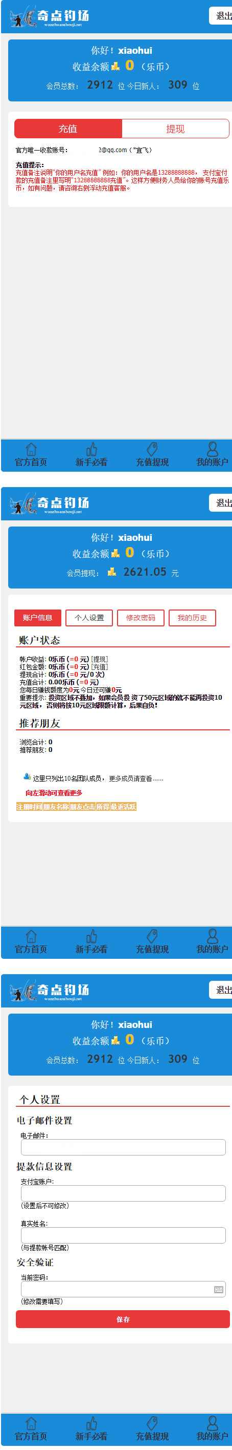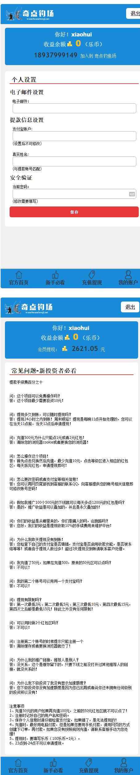 常见问题-新投资者必看 提款手续费百分之十 问:这个项目可以免费操作吗? 答:这个项目最少需要投资10元! 问:提现多久到账,可以随时提现吗? 答:提现24小时之内到账!周末顺延!提现是每晚11点开始处理的,您可以在当天11点前,当天12点后申请提现! 问:充值500元为什么只能点1元或者2元红包! 答:清除您的浏览器cookie或者更换您的浏览器! 问:怎么操作这个项目! 答:首先点击兑换然后充值,最少充值10元,点击等级区进入相应的红包区,每天拆完红包,申请提现即可! 问:怎么更改密码或者支付宝等相关信息! 答:您可以再网页尾部找到客服的联系QQ,向客服提供您的帐号相关信息即可修改账号密码! 问:假如我推广100个500元的下线就可以每天多点1200元的红包是吗? 答:是的,推广收益是可以叠加的,并且是永久叠加的! 问:你们的收益是从哪里来的,你们是骗人的吗,会跑路吗? 答:您好,我们的收益是提现收取10%的手续费用来维护平台! 问:为什么我昨天提现没有到账! 答:您检查下自己的支付宝是否填错,支付宝是否启用收款功能,是否被冻结等等!或者由于提现人数过多!超过3天提现没到帐请联系客户处理。 问:我充值了50元,如果在充值500,原来的50元区可以点吗? 答:不可以! 问:我的第二个账号可以用同一个支付宝吗? 答:不可以! 问:提现有限制吗? 答:第一次最低3元、第二次最低5元、第三次最低10元、第四次最低15元,第四次之后都是最低15元!除此之外没有任何限制! 问:可以同时做2个红包区吗? 答:不可以! 问:注册第二个账号的时候提示只能注册一个 答:清除缓存或者更换浏览器就行了! 问:为什么我的推广链接,推荐人是别人? 答:没关系,这个是缓存留下的,只要下线之前没打开过其他推荐人的链接,就没关系的! 问:为什么我下级投资了我没有显示加速额度? 答:您下级投资你没有加速额度是因为您已出局或者说你还未拥有任何级别的投资所以没有! 注意事项 1、充值50元的用户如果再充值100元,之前的50元红包区就不可以点了! 2、注册时记好自己的用户名和密码。 3、保存个人信息时请仔细检查支付宝,如果错了,是无法提现的! 4、充值时,最好用电脑付款,但是如果您要用手机付款,请用网页的方式创建下订单,再付款。如果您没有按照规则充值,请联系客服手动为您处理! 5、提现时,要填写乐币(100乐币=1元)。 6、23点到-24点不可以申请提现。