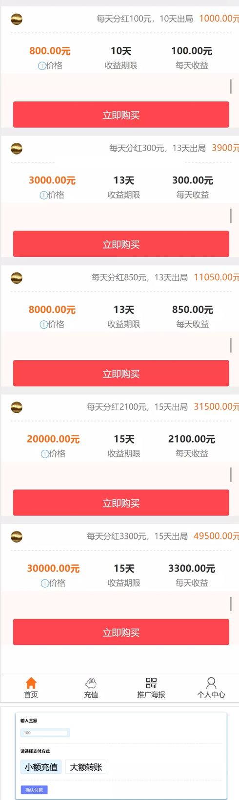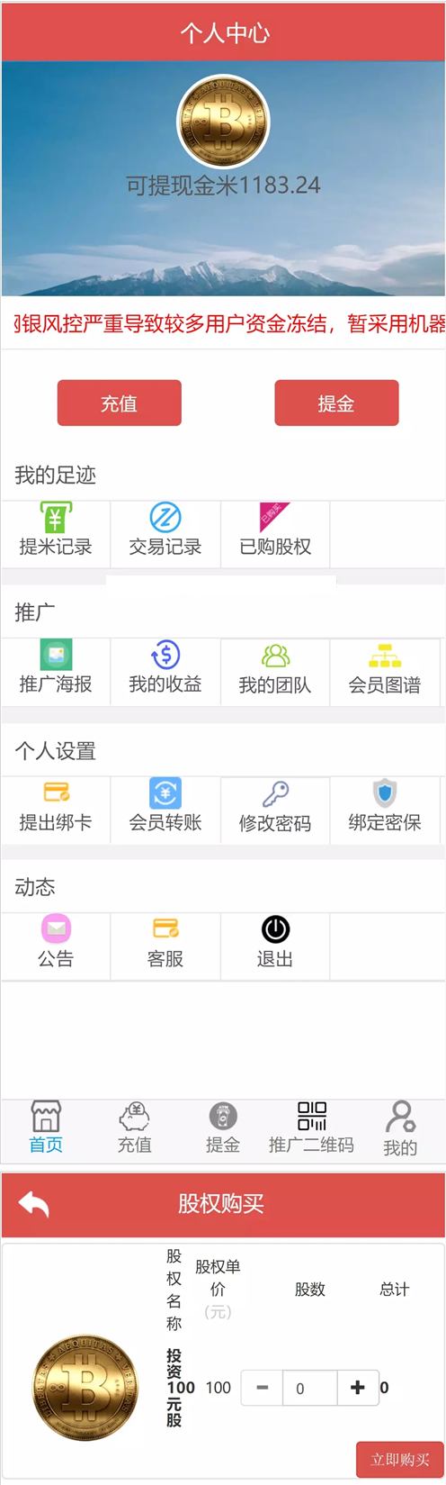 商品编号:投资股权购买系统,带有团队系统,充值提现功能正常,可以自行对接第三方支付,带有完整安装教程