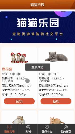 2.原则上每天交易时间分8个时段,采取强制挂卖和预约方式,即每个会员的宠物猫到期之后将被强制挂卖,挂卖的宠物猫将被市场其他会员领养。