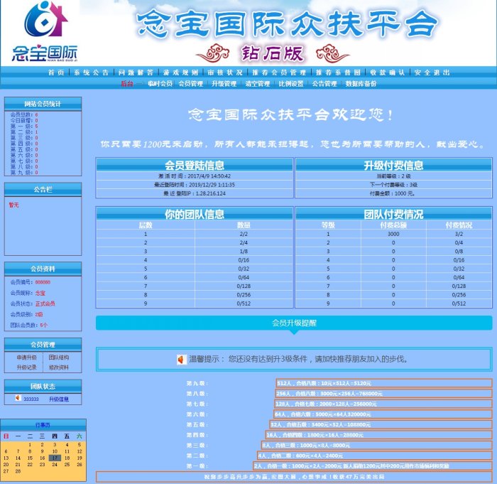 2x6 六级会员出局制念宝国际众扶平台升级提醒功能双轨矩阵倍增系统