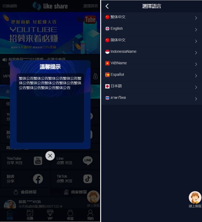 国际版多语言点赞抖音分享点赞任务平台源码,多种语言,点赞任务平台源码。可封装APP。