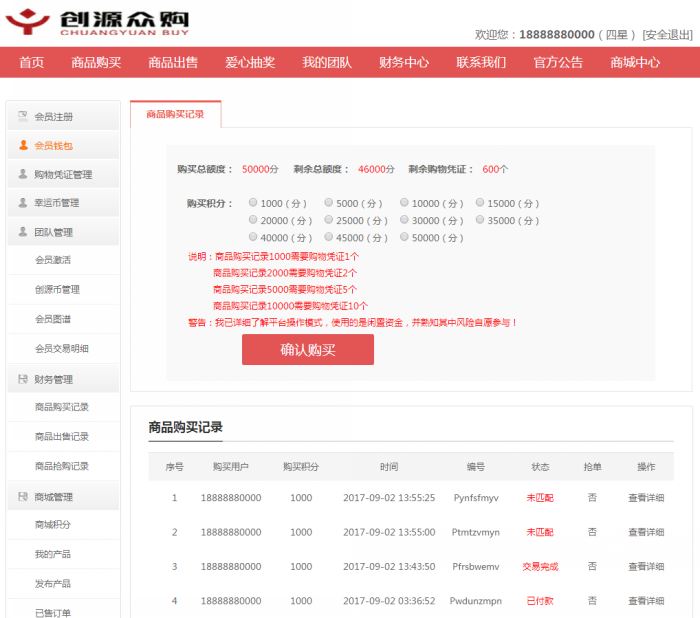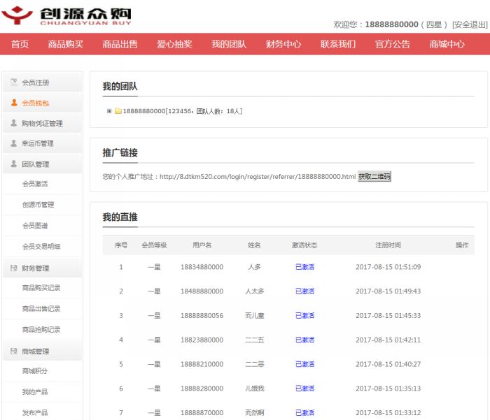 七,控盘制度 1,为防止不诚信会员投机,平台注册需激活码,排单需排单。 2,排单24小时内,需要打预付款,预付款为排单额度的10%,如排单5000需打500预付款,尾款3到6天匹配打款。 3,防止大团队进出对平台的冲击,团队人数不能超过29人。 4,防止泡沫,推荐奖冻结30天后可提。提现额度为500和500的倍数。 5,会员累计收益达到排单最高额度时(如会员累计收益5万元,排单限额也是5万元),数据清零,排单额度降为5千元。 6,对登陆Ip地址监测,杜绝一人多账户。 7,直推一代奖金的10%、二代奖金的20%作为商城维护费用及抽奖费用。