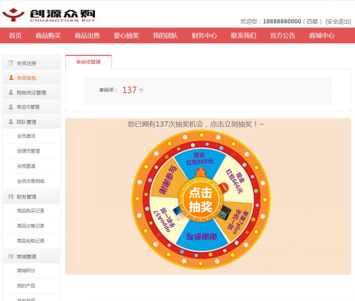 八,平台消除泡沫经济 1,全新商城模式会员可以自由发布进行消除平台泡沫经济,全程由平台审核控制操作, 2,幸运转盘抽奖提高会员参与积极性,更有效的消耗泡沫经济,后台参数可详细设置!人人均有中奖机会。排单并打出资金后,您的推荐奖金释放即可参加抽奖,100元可参与一次,中奖率90%。