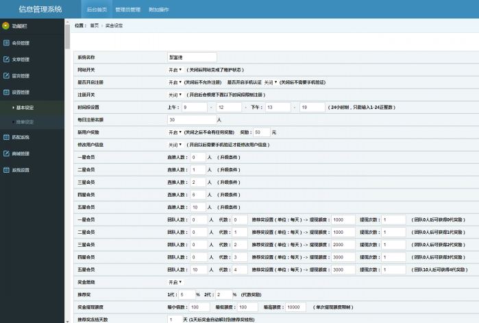 四,推荐奖制度 1,新注册会员初始额度每人5000元,每直推一个有效会员额度增加5000,最高50000封顶。 2,奖励,直推一代6%二代3%四代以后%0.1最高可提九代奖励。 3,推荐奖奖金冻结期为30天,解冻后每天可以提现一次,最低提现500,封顶一次提10000元。