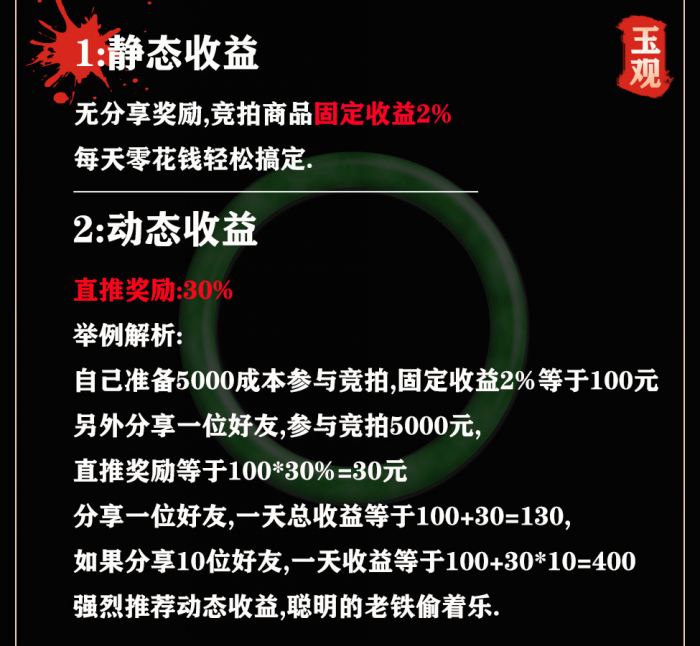 可以选择提货或者隔天进行转拍获利,每日转拍增值百分比可在后台自由调整,如每日增值百分比等玩法;收款方式多种多样无需对接第三方支付即可完成交易;