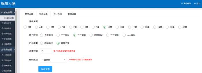 二、该模式结合三三复制倍增裂变制度,一星升二星,二星升三星没有条件,三星升四星需要完成3个直推一星会员才可以继续升星收更多红包;