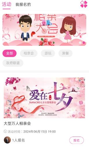 相亲活动模块用于组织和管理线下或线上相亲活动。用户可以报名参加系统组织的各类相亲活动,