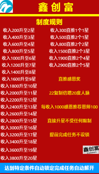 静态无分享者2星220起步可获得自己账号下2度3个100,这时候账号锁定,想拿以后红包快速完成两个直推;